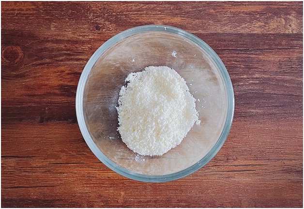 Cho vụn cơm dừa vào bát, thêm bơ lạt đã làm mềm ở nhiệt độ phòng và 10g đường bột vào trộn đều.
