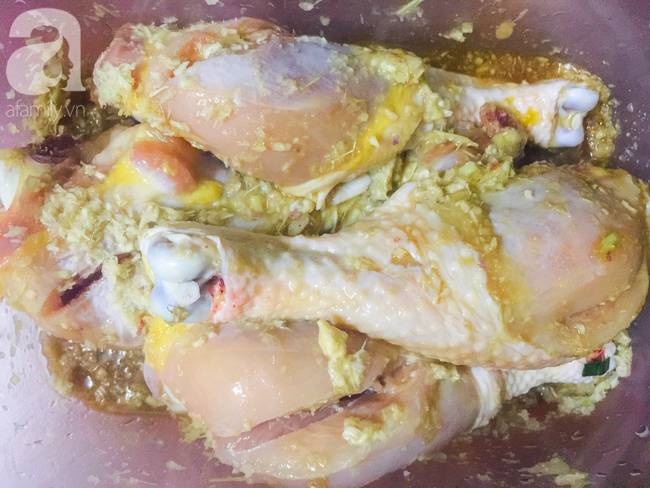 Gà rửa với giấm và muối cho sạch, để ráo. Cho hỗn hợp đã xay vào ướp gà rồi để vào trong ngăn mát tủ lạnh khoảng 2 tiếng.