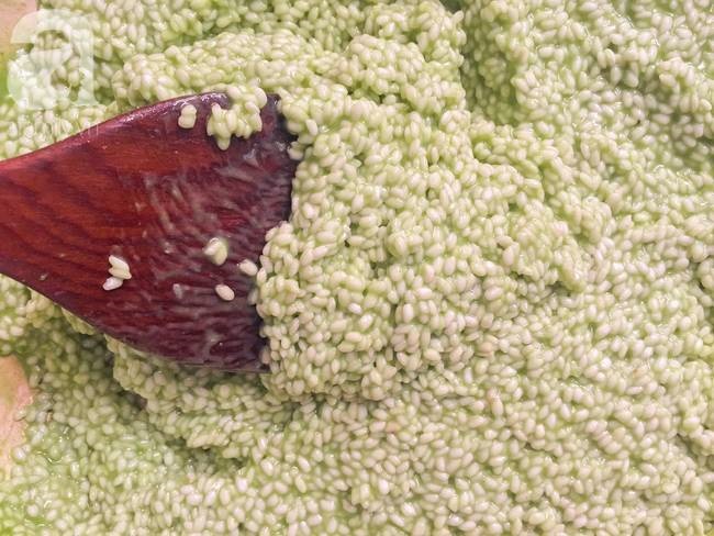 Phần nếp đã vo sạch để ráo cho vào chảo cùng nước cốt dừa và nước ngò đã xay. Nêm ít hạt nêm và đường. Bật bếp đảo đều cho gia vị ngấm vào phần nếp để khi hấp được nhanh hơn.