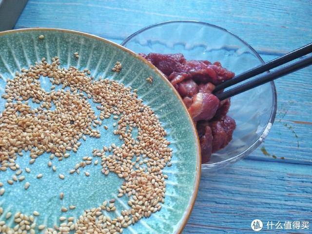150gr thịt bò, xì dầu, rượu trắng, gia vị, hạt tiêu, tinh bột ngô, vừng trắng.
