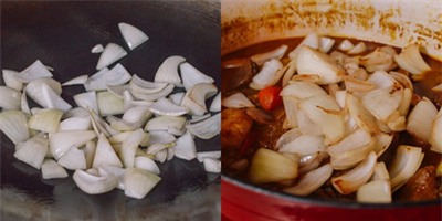 ![]() | ![]() Cho một muỗng canh dầu ăn vào trong chảo, để bếp ở lửa vừa. Cho hành tây cắt khúc vào đảo đều trong khoảng 2 phút thì cho vào nồi cà ri, đun liu riu trong khoảng 5 phút. |