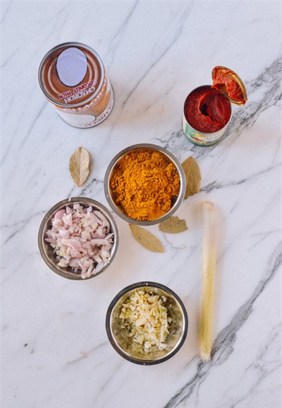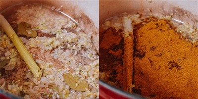 ![]() | ![]() Cho 50g dầu ăn vào chảo, để bếp ở lửa vừa. Sau khi dầu nóng đều thì cho tỏi băm, hẹ tây băm, củ sả đập dập, lá bay vào phi thơm. Hạ nhỏ lửa, thêm bột cà ri và bột nghệ vào khuấy đều. Nếu bột cà ri bị dính đáy chảo thì các bạn nhớ thêm dầu vào nhé! |