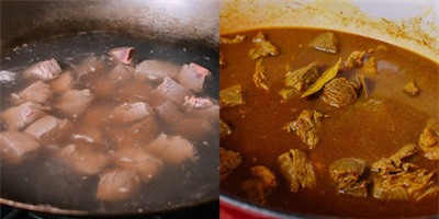 ![]() | ![]() Sau một phút thì đổ nước vào hỗn hợp, để lửa nhỏ. Trong lúc đó, bạn bắc nước sôi để chần qua phần thịt bò cắt khúc để khử mùi hôi, sau đó cho vào hỗn hợp nước cà ri. Thêm nước cốt dừa, khoai tây, cà rốt cắt khúc và đậy nắp, đun lửa nhỏ trong 20 phút. |