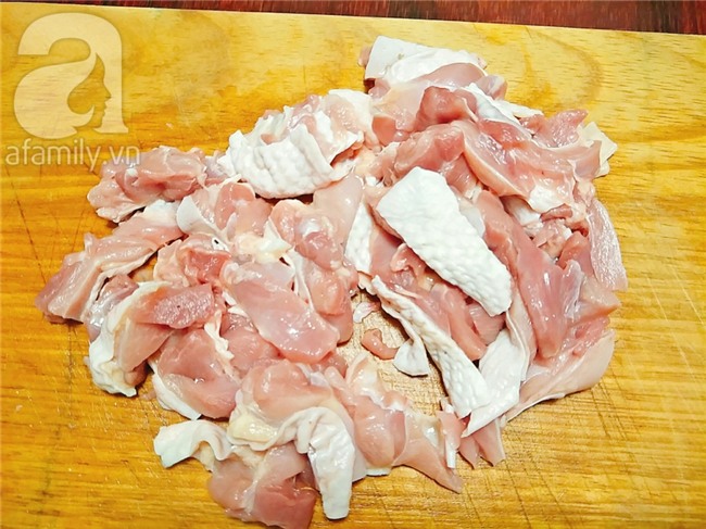 Thịt gà lọc bỏ xương rồi rửa sạch sẽ và thấm khô sau đó thái thành các miếng vừa ăn.