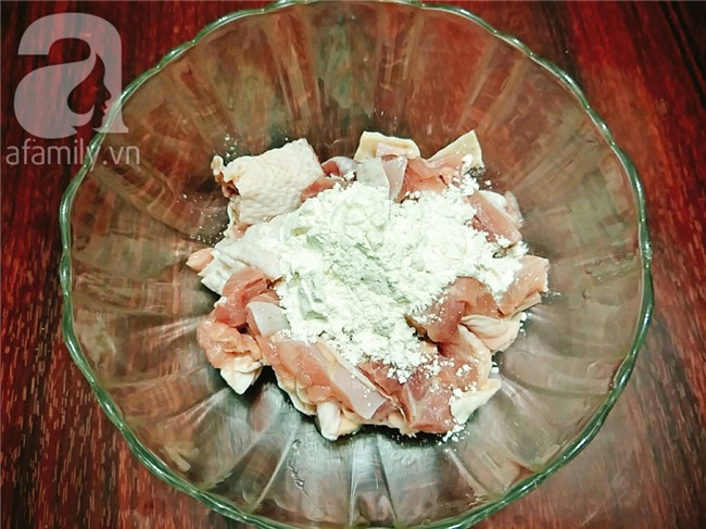 Cho thịt gà vào 1 cái tô rồi thêm bột chiên giòn sau đó xóc đều cho thịt bám đều 1 lớp bột bên ngoài.