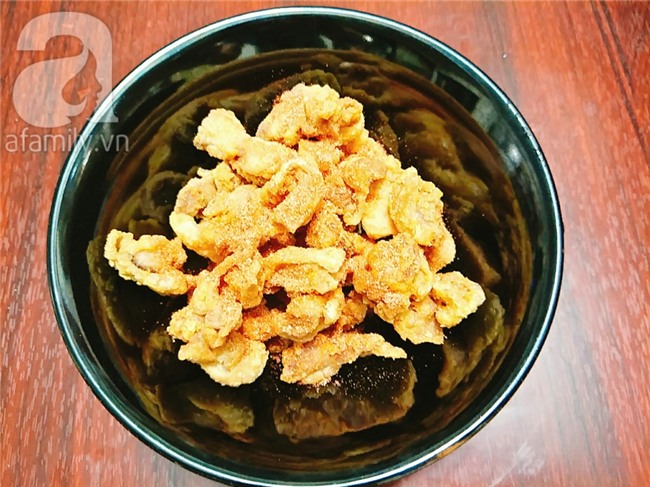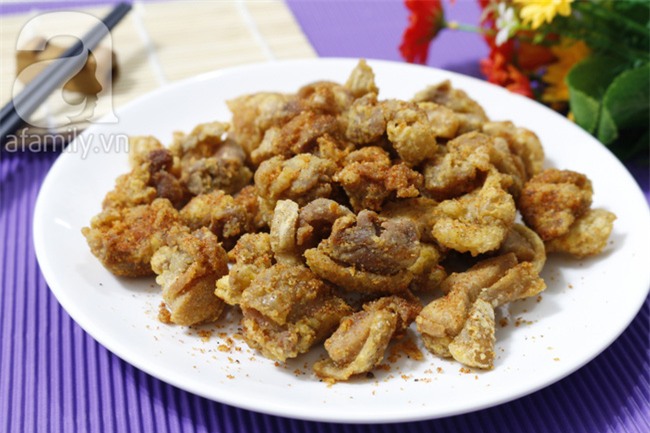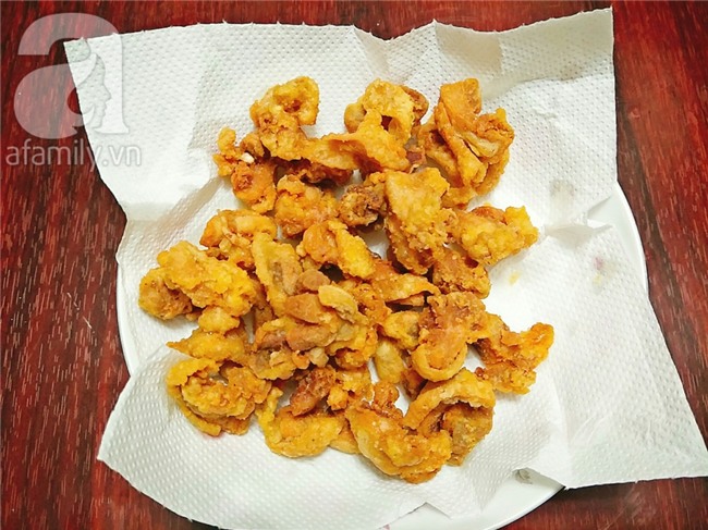 Cho nhiều dầu vào nồi đun nóng dầu sau đó gắp từng miếng thịt gà cho vào chiên, tới khi thịt gà chín vàng giòn thì vớt ra đĩa có lót sẵn giấy thấm dầu.