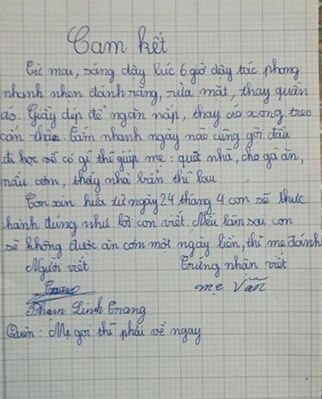 Trước đó, cũng có rất nhiều “bản cam kết”, “xác nhận”, “ký gửi” hài hước của các em nhỏ gửi cho phụ huynh thể hiện sự... không tin tưởng và mong muốn phụ huynh thực hiện những gì mình nói.