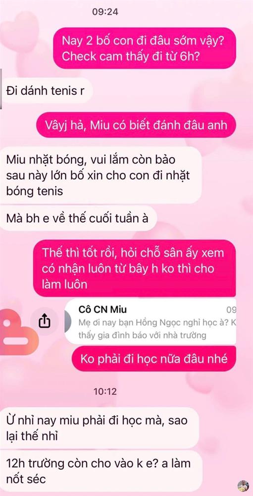 Sáng sớm nay, khi cô giáo chủ nhiệm nhắn chuyện con nghỉ học mà không thông báo với nhà trường đã khiến chị tá hoả. Chị lập tức hỏi thì chồng hồn nhiên đáp: "Sáng 2 bố con đi đánh tennis, Miu (tên ở nhà của con gái) đi nhặt bóng vui lắm, còn bảo sau này lớn bố xin cho con đi nhặt bóng tennis".