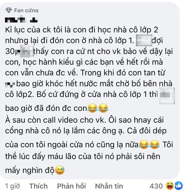 Trong khi đó, con tan học từ bao giờ, khóc hết nước mắt chờ bố bên nhà cô giáo lớp 2. Bố cứ đứng ở cửa nhà cô giáo lớp 1 thì biết bao giờ đón được con. À sau còn call video cho vợ. Ôi sao hôm nay cái cổng nhà cô nó lạ lắm các ông ạ. Cả đôi dép của con tôi ngoài cửa nó cũng lạ nữa. Tôi thề lúc ấy máu não của tôi phải sôi lên mấy nghìn độ".
