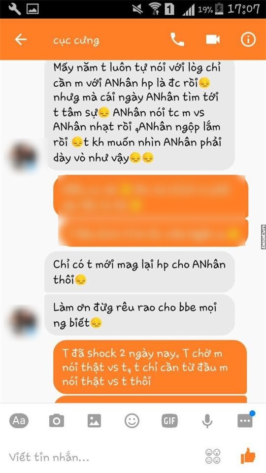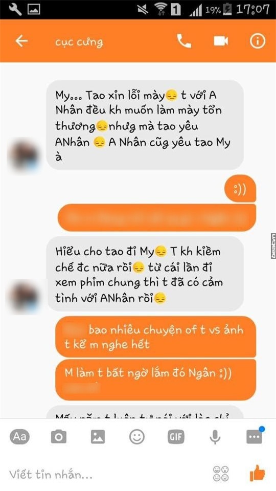 N cũng xin lỗi và năn nỉ M đừng chia sẻ chuyện này cho biết. Nhưng rồi càng về sau, N càng lên giọng. "Là do mày không biết giữ mối quan hệ thôi đừng trách tao", "chỉ cần yên lặng để tao với anh ấy bình yên hạnh phúc bên nhau", rồi "nhìn lại đi, có bao giờ bằng tao không", "tao đẹp là được, cuộc đời này chỉ cần xinh đẹp". Thậm chí, N còn khiến nhiều người há hốc mồm khi nói cô bạn bị mình cướp người yêu rằng: "Cái đứa không đẹp mà còn ngu như mày thì không ai bênh đâu".