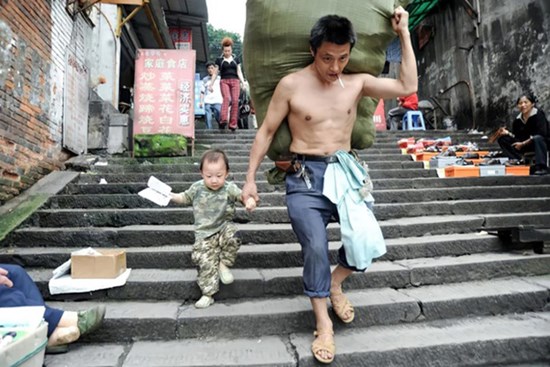 Đã 11 năm trôi qua kể từ khi bức ảnh ghi lại khoảnh khắc 1 người đàn ông làm nghề cửu vạn đang vác trên vai bao tải nặng cả trăm kg nhưng vẫn không quên nắm chặt tay cậu con trai nhỏ, bước từng bậc xuống cầu thang được lan truyền rộng rãi trên internet xứ Trung.