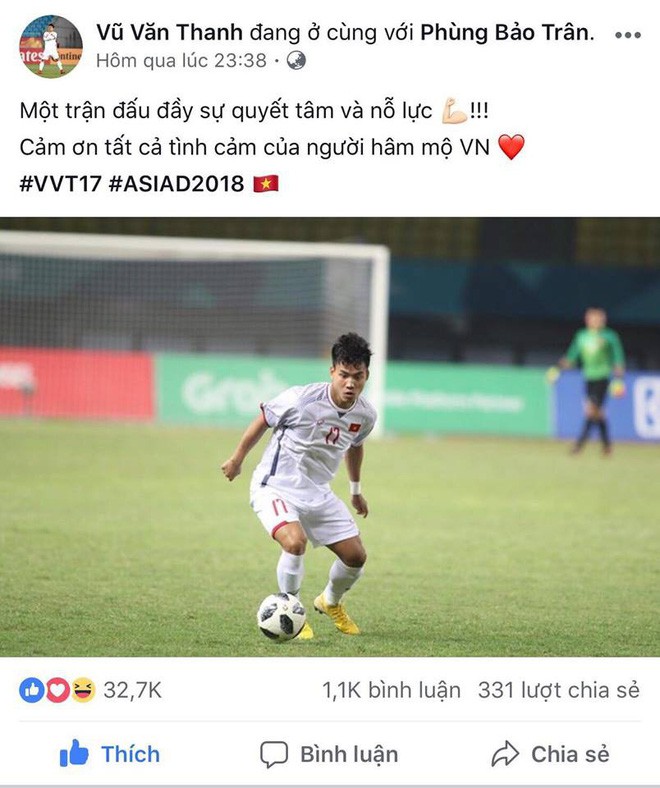 Hậu chiến thắng trước Syria và trước thềm trận đấu quan trọng, Văn Thanh - chàng hậu vệ điển trai, nam tính đến từ CLB HAGL cũng đã có những chia sẻ. Anh chàng đăng tải hình ảnh của mình ở trận đấu trước với caption: "“Một trận đấu đầy sự quyết tâm và nỗ lực!!! Cảm ơn tất cả tình cảm của người hâm mộ VN. #VVT17 #ASIAD2018”. Một dòng chia sẻ được đánh giá là khá "nhạt" so với độ mặn mà của các cầu thủ khác trong đội tuyển Olympic Việt Nam như Đức Chinh, Đức Huy.