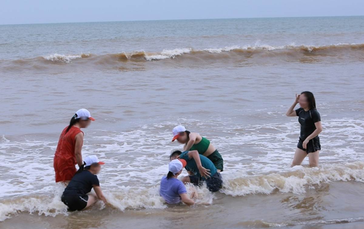 Có rất nhiều phụ nữ xuống tắm biển trong khi trời đã bắt đầu mưa, sóng biển dâng cao