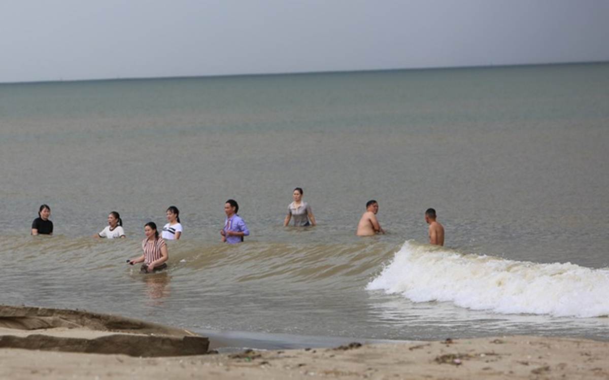 Đáng nói, trong số những du khách xuống tắm biển có rất nhiều phụ nữ, thậm chí cả trẻ em cũng xuống bãi biển tắm biển, tạo dáng chụp ảnh.