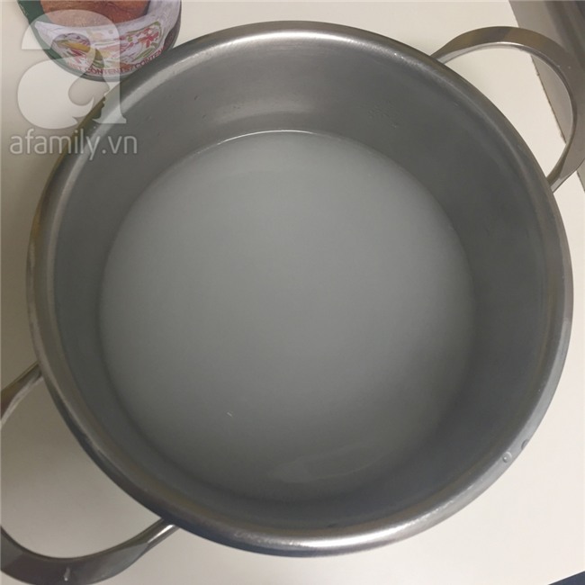 Nước dừa và đường phèn cho lên bếp đun sôi, có thể hòa thêm chút nước cốt dừa nếu muốn tăng vị thơm béo. Sau đó để nguội.