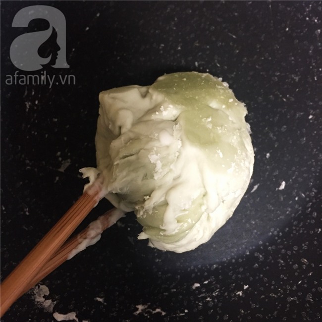 Lấy 50g bột năng, trộn cùng nước cốt lá dứa sau đó cho vào chảo chống dính, đun cho đến khi khối bột quánh lại.