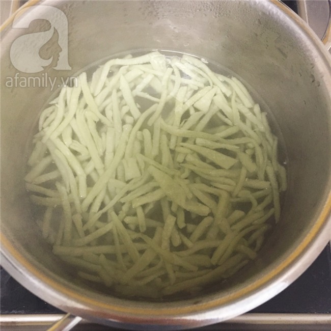 Bắc nồi nước lên bếp, đun sôi, thả phần sợi lá dứa vào, khi sợi trân châu nổi lên mặt nước thì vớt ra.
