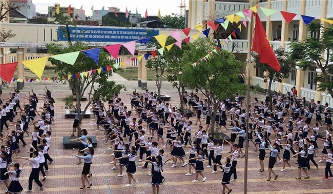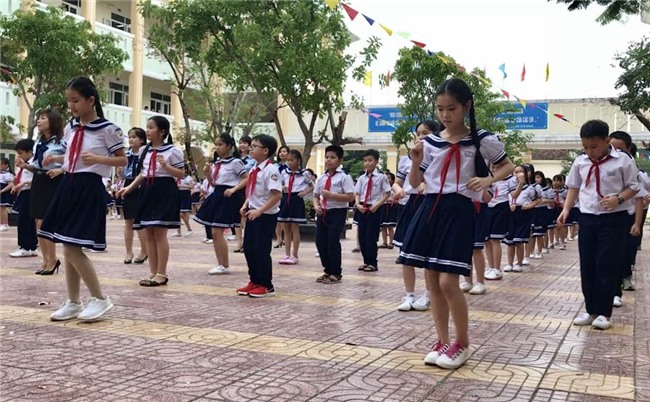 Hoạt động ngoại khoá của trường Tiểu học Nguyễn Nghiêm, TP.Quảng Ngãi với vũ điệu "Cha cha cha" khiến nhiều người thích thú.