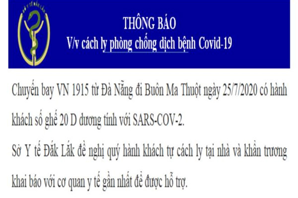 - Ngày 29/7/20 bệnh nhân được đưa đi cách ly tại Trung tâm Y tế huyện Hòa Vang và được lấy mẫu xét nghiệm đến ngày 30/7/2020 bệnh nhân có kết quả (+) với vi rút SARS-CoV-2.