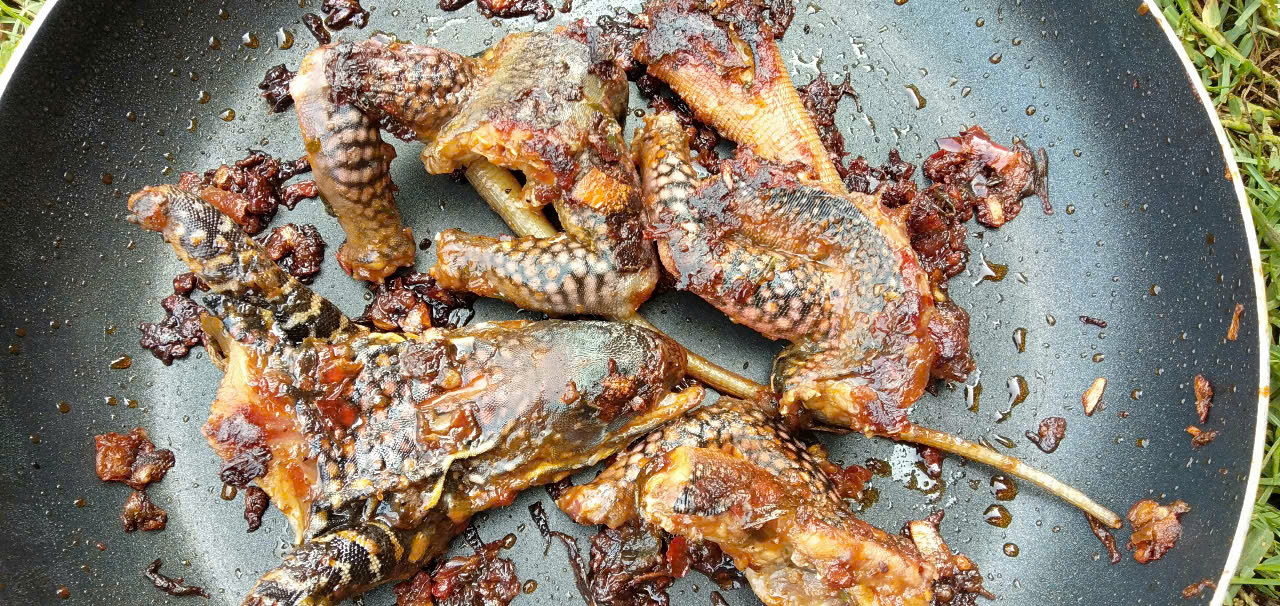 Với món dông nướng, người dân địa phương thường để nguyên con rồi tẩm ướp gia vị. Với các món như canh, lẩu, kho, xào…, thịt dông được chặt miếng vừa ăn rồi chế biến phù hợp theo công thức từng món.