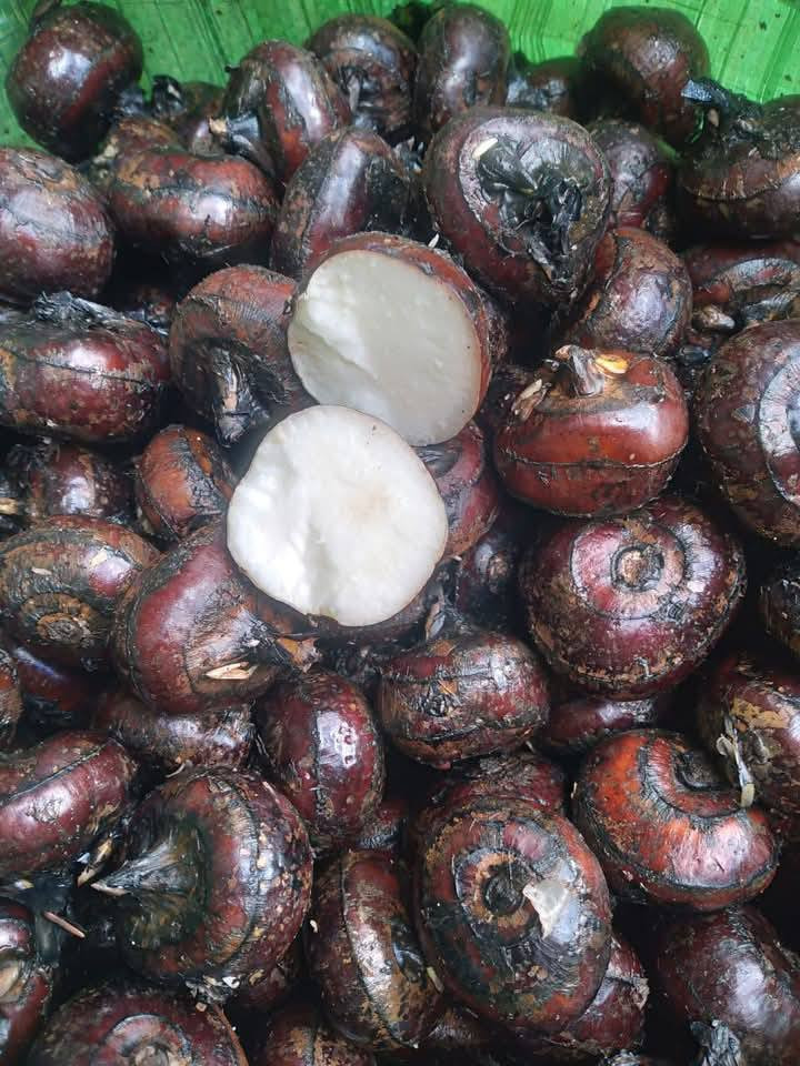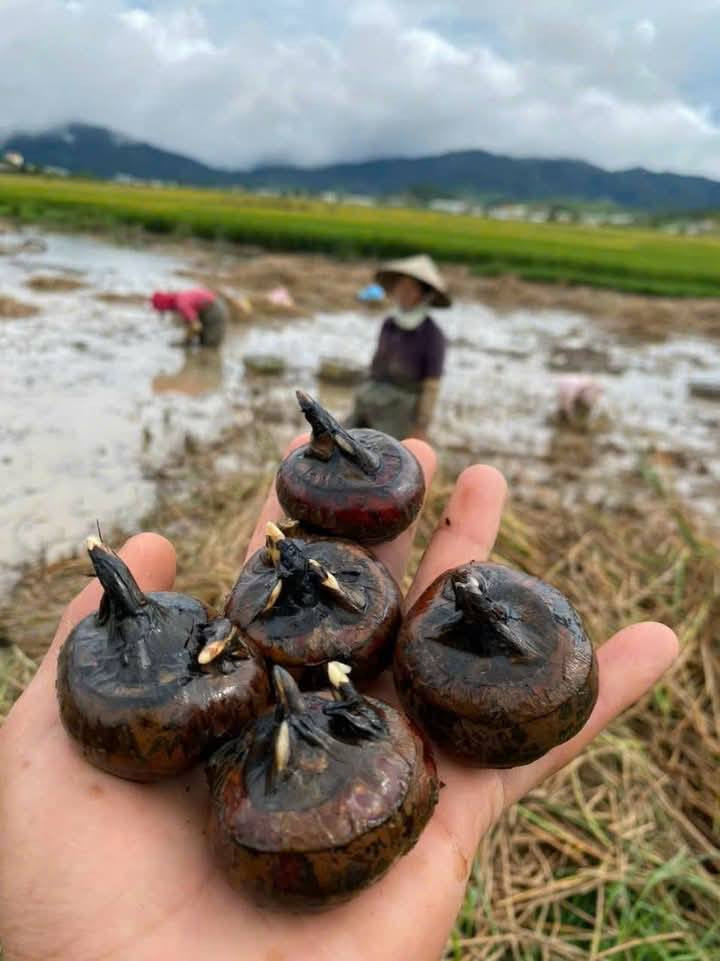 Sau khi được nhổ lên khỏi bùn đất, củ mã thầy được người dân đem rửa sạch, để lộ lớp vỏ màu nâu đen bên ngoài.
