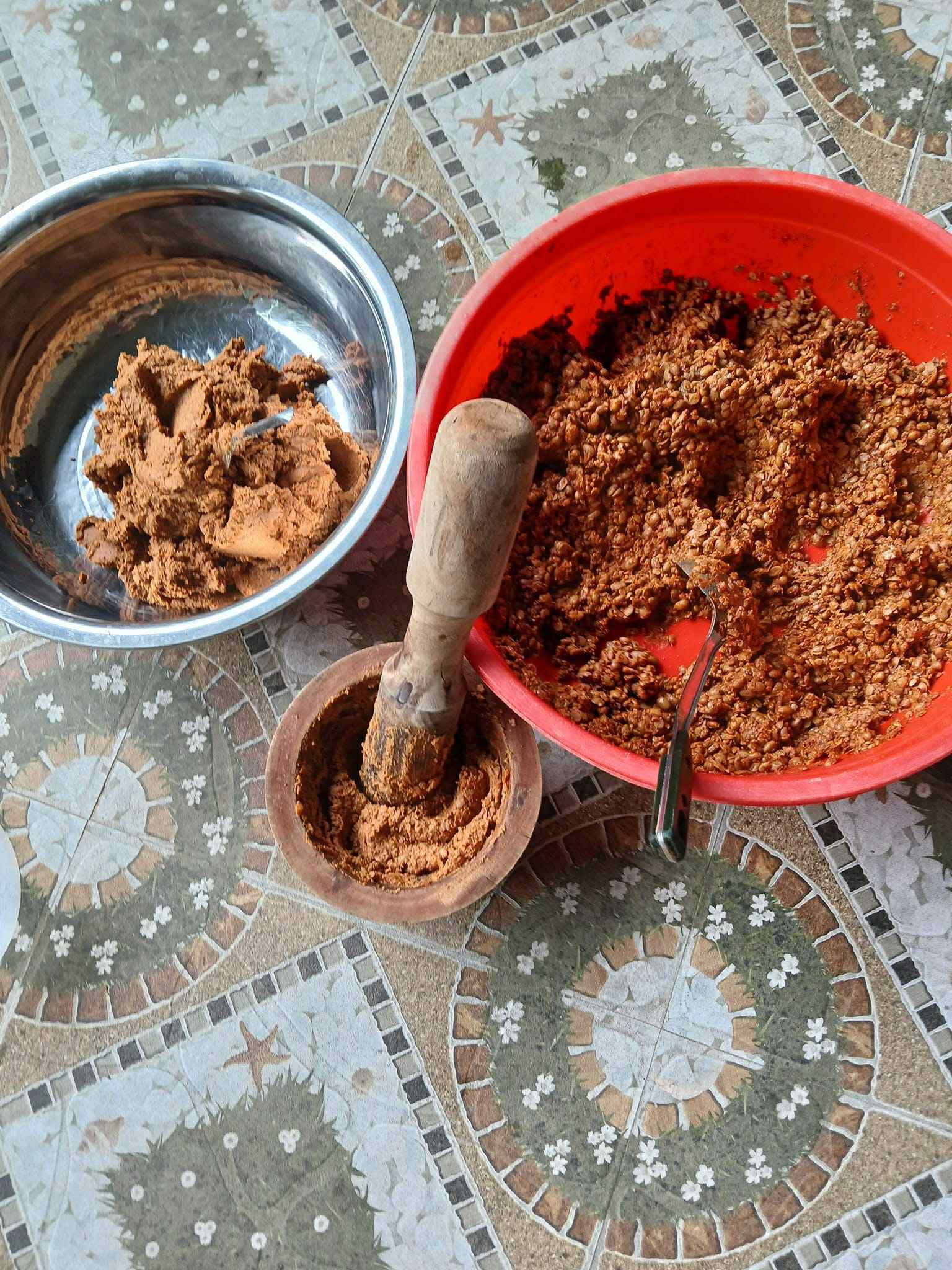 Dưới tác động của nhiệt tỏa ra từ bếp, đậu tương bắt đầu chuyển vị mằn mặn, ngậy và dậy mùi thơm nồng đặc trưng. Khi ấy, bà con sẽ lấy đậu ra, đem giã nhuyễn cùng 1 số gia vị quen thuộc như tỏi, bột ớt, muối…