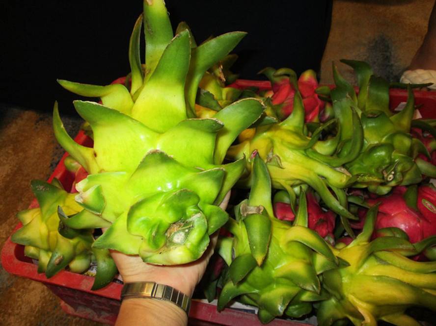 Sau khi mua thử vài quả, chúng tôi bổ ra xem thì thấy thanh long này có vỏ rất dày, cơm bên trong màu trắng tương tự như thanh long ruột trắng nhưng ít hạt hơn, vị khá nhạt nhẽo.