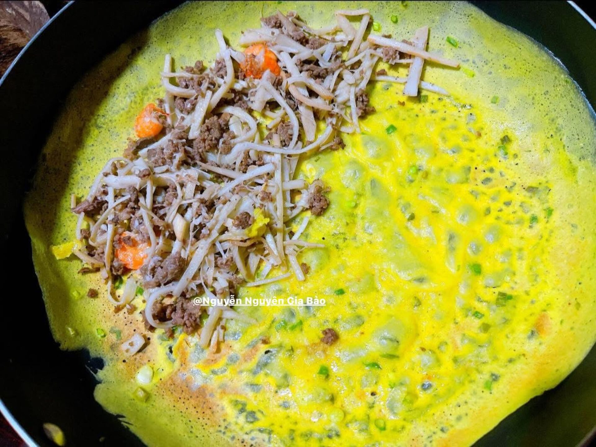 "Khi nhắc đến bánh xèo miền Tây, người ta thường nghĩ đến nhân tôm, thịt, giá đỗ truyền thống. Nhưng ở Bến Tre quê mình, bà con hay dùng thịt vịt bằm, tôm và củ hũ dừa làm nhân bánh", chị Bảo cho biết.