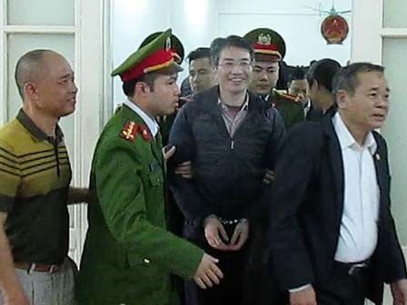 Bước ra từ phòng xét xử, Giang Kim Đạt vẫn tỏ ra tươi vui, khi nhìn thấy người quen bị cáo đã cười.