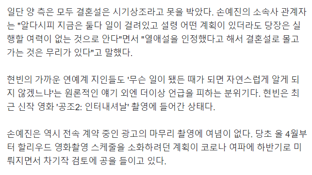 Đại diện công ty chủ quản của Son Ye Jin cho biết: "Như bạn đã biết, cả hai người trong số họ đều đang bận và ngay cả khi họ có bất kỳ kế hoạch nào đi chăng nữa, họ cũng không đủ khả năng để thực hiện chúng ngay bây giờ. Thật quá đáng khi thúc đẩy chuyện kết hôn chỉ vì họ vừa thừa nhận hẹn hò".