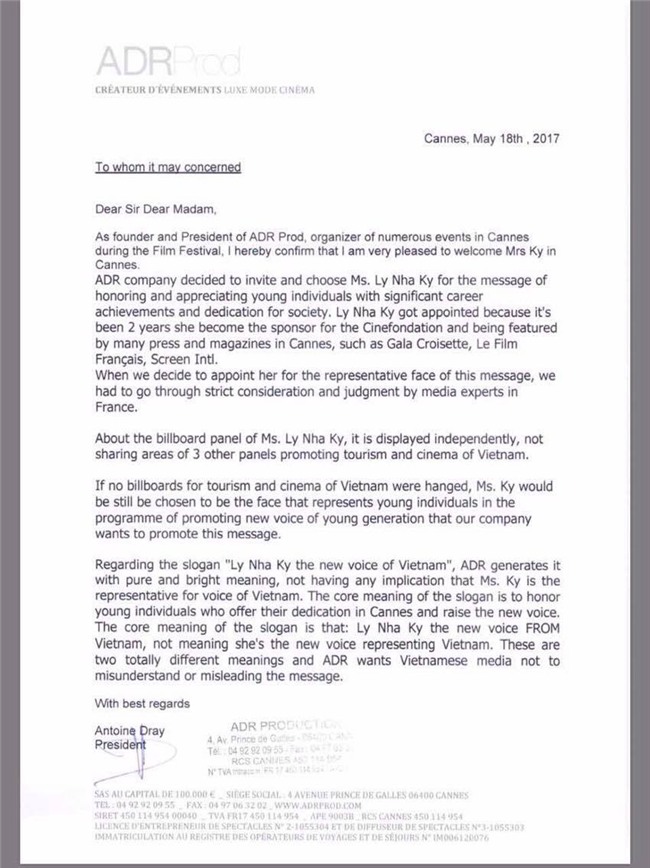 Mới đây, Chủ tịch đồng thời là người sáng lập công ty tổ chức các sự kiện tại Cannes ADR Pord - Antoine Dray chính thức gửi thư tới cơ quan báo chí truyền thông trong nước để nói rõ về việc này.