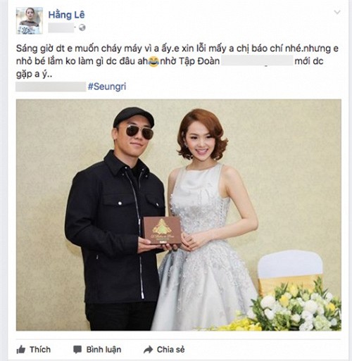 Mới đây, trên Facebook cá nhân của mình, Minh Hằng không giấu nổi niềm vui khi được gặp Seungri. Không chỉ khoe bức ảnh chụp cùng thần tượng Hàn Quốc nhận chìa khóa căn hộ 1 triệu USD mà Minh Hằng còn tiết lộ ngày hôm nay cô bị gọi điện thoại đến “cháy máy” vì Seungri. “Sáng giờ điện thoại em muốn cháy máy vì anh ấy. Em xin lỗi mấy anh chị báo chí nhé nhưng em nhỏ bé lắm không làm gì được đâu ạ” – Minh Hằng viết.