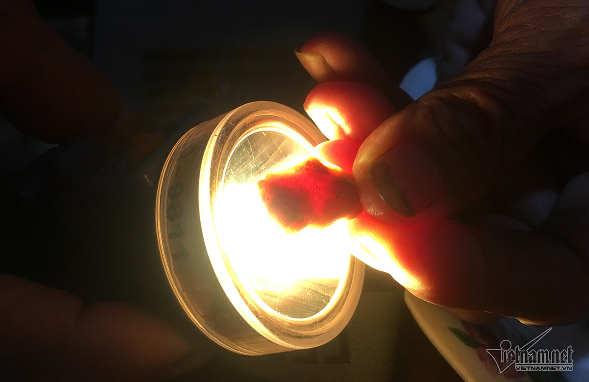 Viên đá ruby màu hơi nhạt mà ông Phong đang soi qua ánh đèn. Ảnh: Quốc Huy