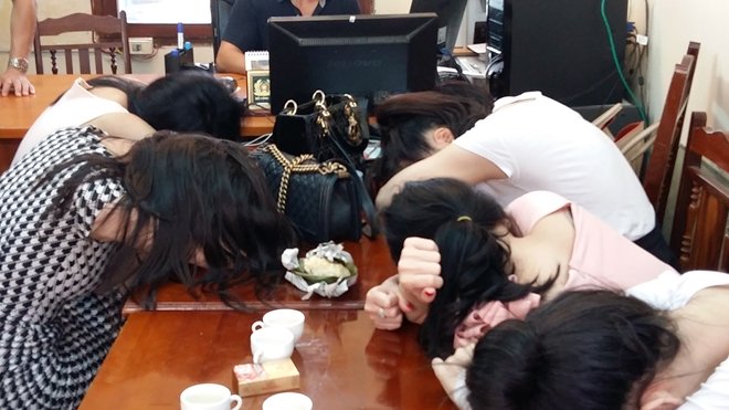 Các gái bán dâm bị bắt quả tang, đưa về cơ quan điều tra trong vụ đường dây mại dâm 14.000 USD. Ảnh: CAND