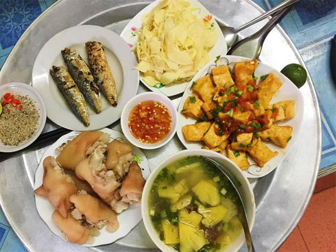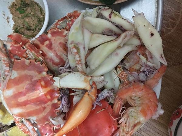 Với cái giá được đưa ra là 600 nghìn, mâm cơm mà N.A dọn ra bao gồm 7 món: Một đĩa thịt gà chặt đầy đặn, một đĩa tôm rim thịt, thịt xào rau củ thập cẩm, cải chip luộc, dưa cà, rau sống và “hoa hậu” của mâm cơm: một đĩa chất vài con mực, vài con tôm, một con cua và một con ghẹ.