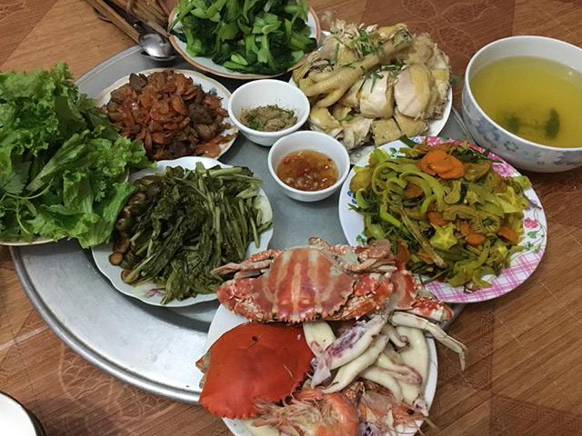 Mâm cơm đầy ăm ắp hải sản bao gồm một đĩa thịt gà luộc, hai con ghẹ, một ít mực hấp, tôm rang thịt, cùng một số món rau ăn kèm.
