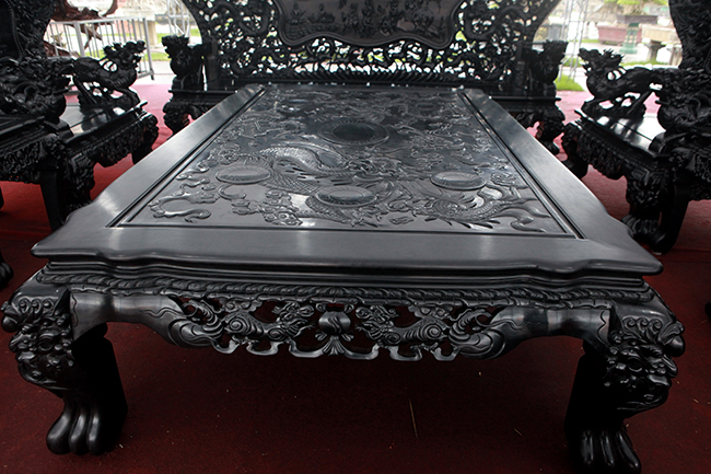 Bàn dài 3m, rộng 2m, được chạm khắc nhiều linh vật như rồng, đại bàng.