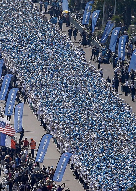 6.400 nhân viên của tập đoàn Tiens cùng xếp hàng và hô vang khẩu hiệu của công ty mình. |