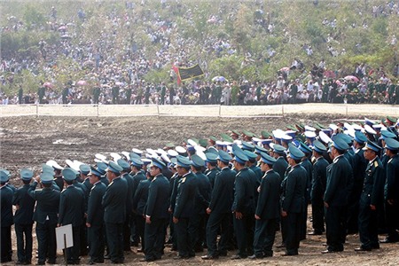 Các tiêu binh di chuyển linh cữu Đại tướng Võ Nguyên Giáp lên núi Thọ. Ảnh: Lê Hiếu