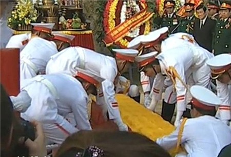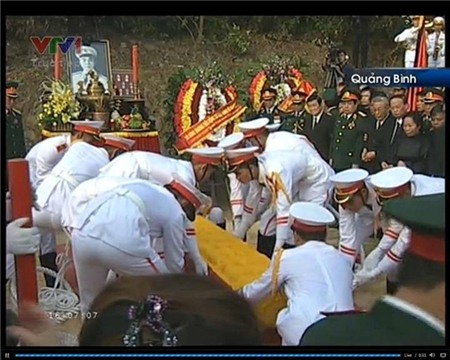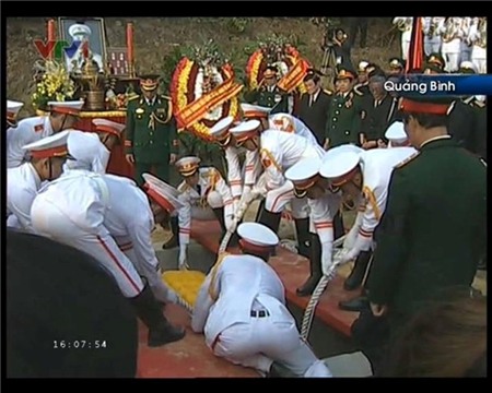 - Linh cữu của Đại tướng đang được các chiến sĩ từ từ đưa vào vị trí phần mộ.