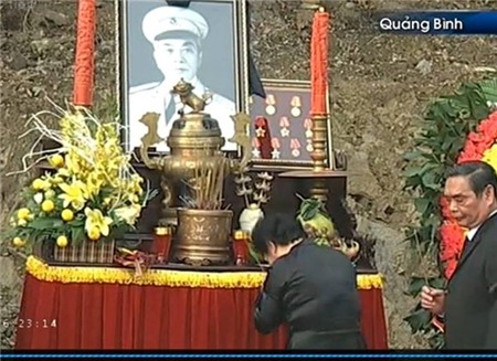 - Linh xa chở linh cữu Đại tướng được phủ quốc kỳ đã lên tới lưng chừng núi, trong ít phút nữa sẽ chuyển vào phần mộ.