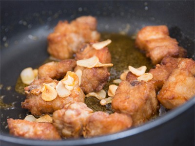 ![]() | ![]() Kế đó trút sườn lợn vào tỏi chiên vào. |