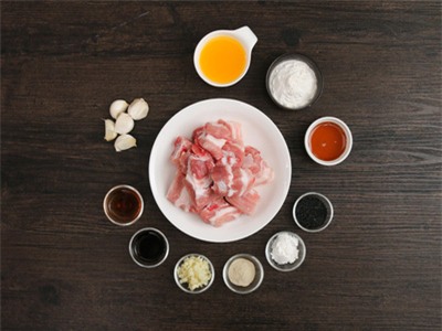 - 6 tép tỏi - 100ml nước cam - 2 muỗng canh mật ong - Bột chiên giòn - Vừng đen Nguyên liệu ướp sườn lợn: - 1 muỗng canh rượu nấu - 1 muỗng canh nước tương nhạt - 1 muỗng canh tỏi - 1 muỗng cà phê tinh bột ngô - Hạt tiêu trắng |