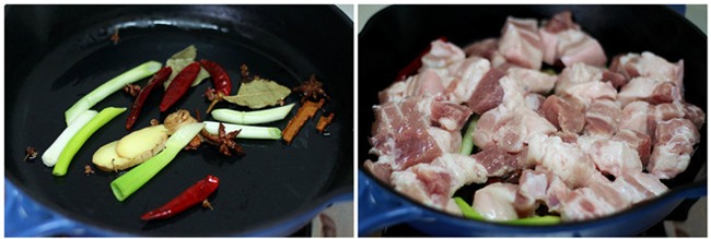 Bắc chảo lên bếp cùng chút dầu ăn sau đó cho: cọng hành lá, gừng, hoa hồi, tiêu, lá nguyệt quế, quế, ớt, tiêu vào đảo nhanh tay cho dậy mùi thơm. Sau khoảng 30 giây thì bạn cho thịt vào xào.