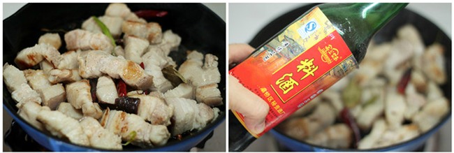 Khi thịt chuyển màu vàng hấp dẫn, bắt đầu tiết mỡ thì cho rượu nấu ăn, nước tương, chút muối vào, đảo nhẹ tay.