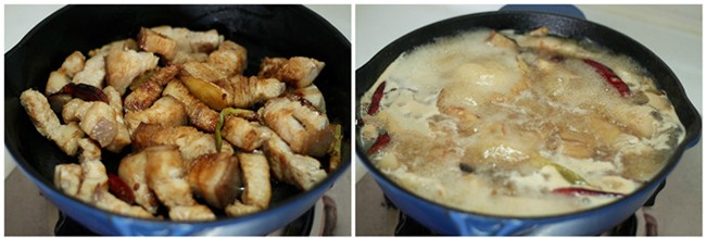 Tiếp đến bạn đổ nước sôi vào cho ngập nồi thịt, hớt bọt, hạ nhỏ lửa và cho đường phèn vào.
