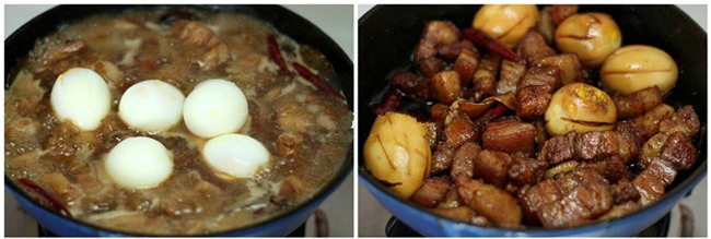 Trong lúc đó, bắc nồi nước sôi luộc trứng. Trứng chín thì vớt ra bóc vỏ, dùng dao rạch các đường dọc thân trứng để gia vị thấm đều. Cho trứng vào nồi thịt kho, đảo sơ qua rồi đậy nắp, nấu cho đến khi nước cạn bớt, gia vị thấm đều thì tắt lửa.