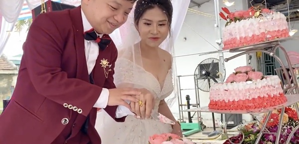 Hai bên gia đình đã tổ chức cho đôi uyên ương một đám cưới ấm cúng, đầy đủ thủ tục. Trong lễ cưới, chú rể phải đứng lên bục để có thể cắt bánh, rót rượu cùng cô dâu nhưng nụ cười luôn hiện trên môi của họ.