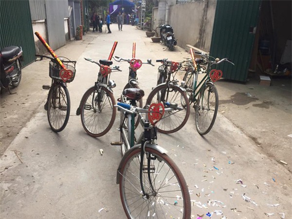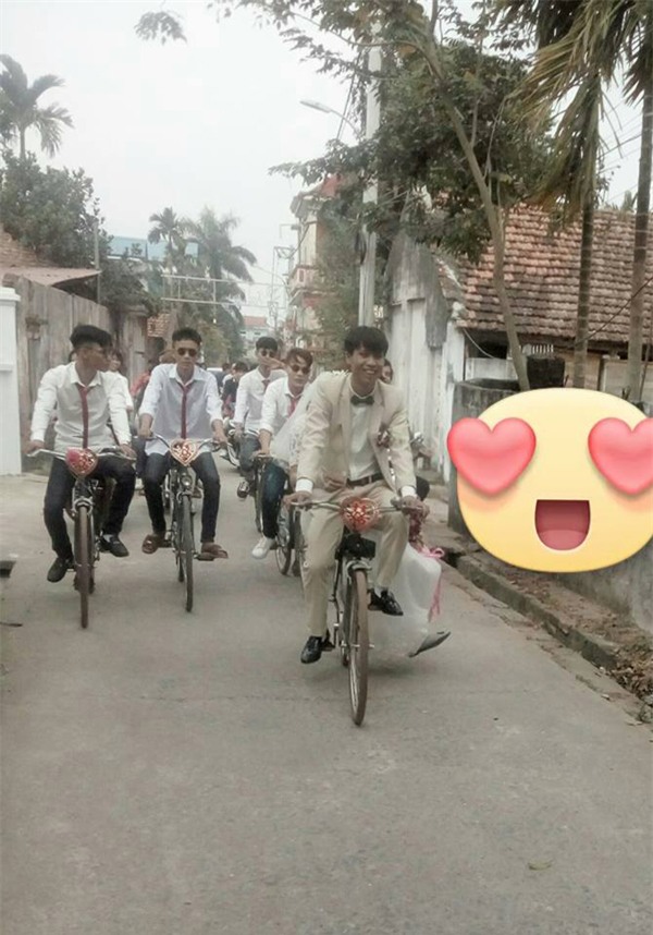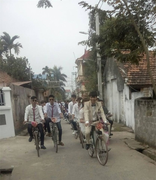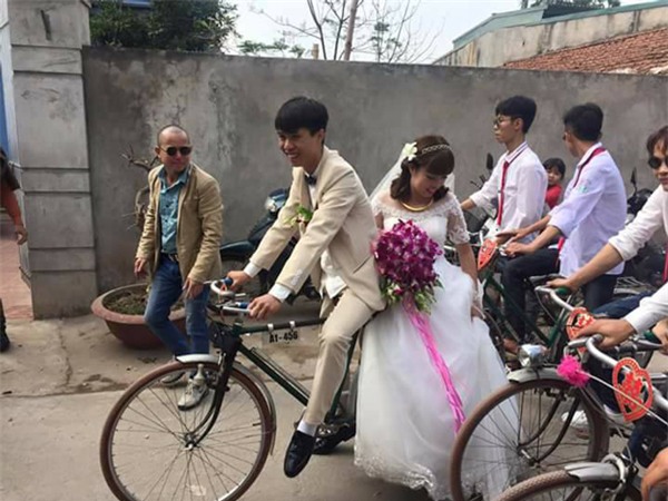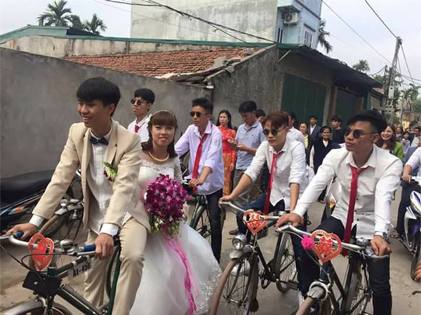 Chú rể rước nàng về dinh trên chiếc xe đạp Thống Nhất màu xanh. Tháp tùng theo sau là 5 thanh niên áo trắng thắt cà vạt đỏ cùng “dàn xe” Thống Nhất và những lời cười nói vui vẻ của bạn bè cô dâu, chú rể. Đám cưới đi trên đường quê thu hút được nhiều sự chú ý của người dân trong vùng.