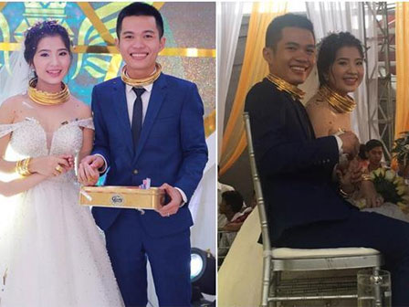 Ngày 19/8, những hình ảnh về "đám cưới vàng" tại Nghệ An đã làm "nóng" nhiều diễn đàn mạng. Theo đó, cô dâu và chú rể được tặng rất nhiều kiềng vàng và trang sức.